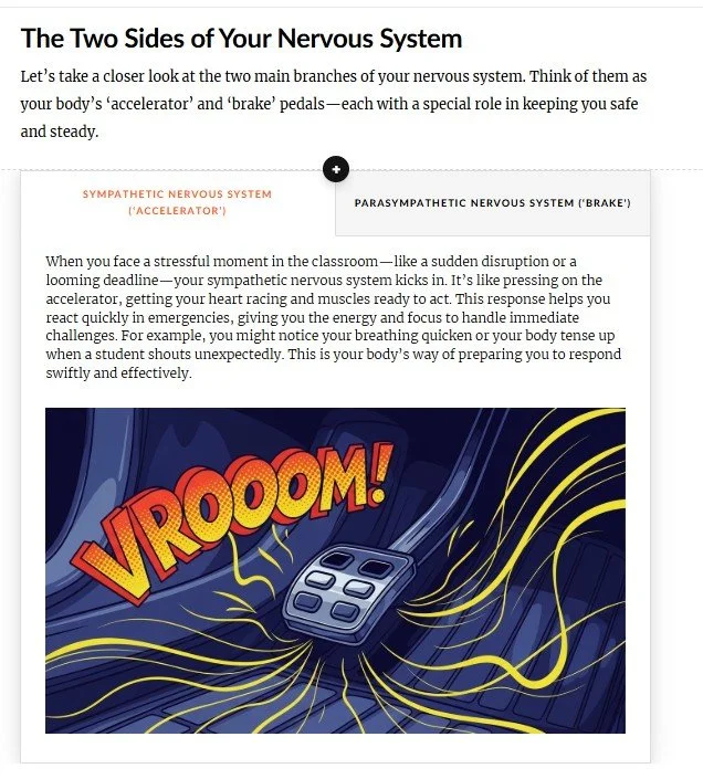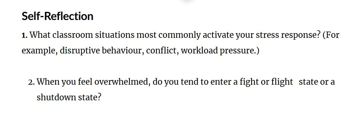 Practical, research‑informed strategies - Every lesson is grounded in neuroscience, positive psychology, and real classroom experience. Teachers learn how their nervous system works, why stress shows up the way it does, and how to use simple regulation tools to feel more calm, connected, and in control.